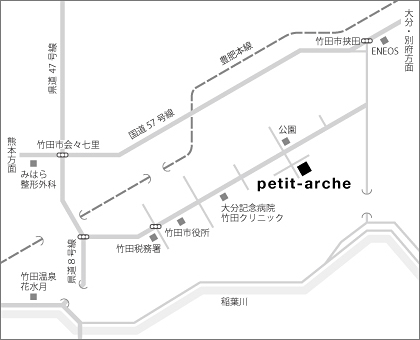 =大分・別府方面よりお越しの場合= 竹田市挟田のガソリンスタンド「ENEOS」の信号を斜め左へ行き、次を右。 坂を登りつめると、右手に公園がある交差点を左へ行き、住宅地内へ入ると、最初の交差点の左角。 =熊本方面よりお越しの場合= みはら整形外科を過ぎ、竹田市会々七里交差点を右へ行き、初めの信号を左へ。 「竹田税務署」→「竹田市役所」→「大分記念病院竹田クリニック」を過ぎると、左手に公園のある交差点を右へ行き、住宅地内へ入ると、最初の交差点の左角。